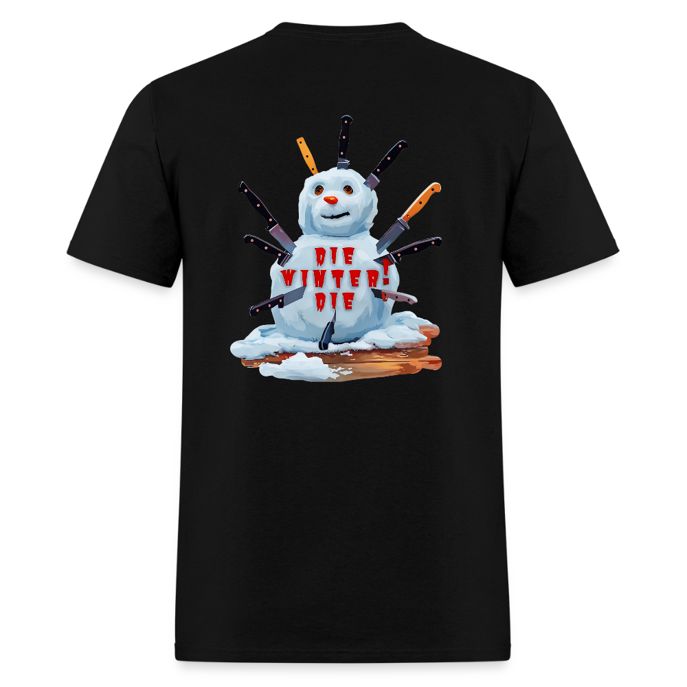 Hate winter? Show it with this hilariously vengeful t-shirt! Featuring a plucky snowman pierced by a barrage of knives, screaming “DIE WINTER! DIE!” in bold red letters, it’s the perfect cute-yet-savage way to express your longing for spring. Soft, comfy fabric meets frosty fury—ideal for cozying up while plotting winter’s demise. Get yours and melt away the blues!
