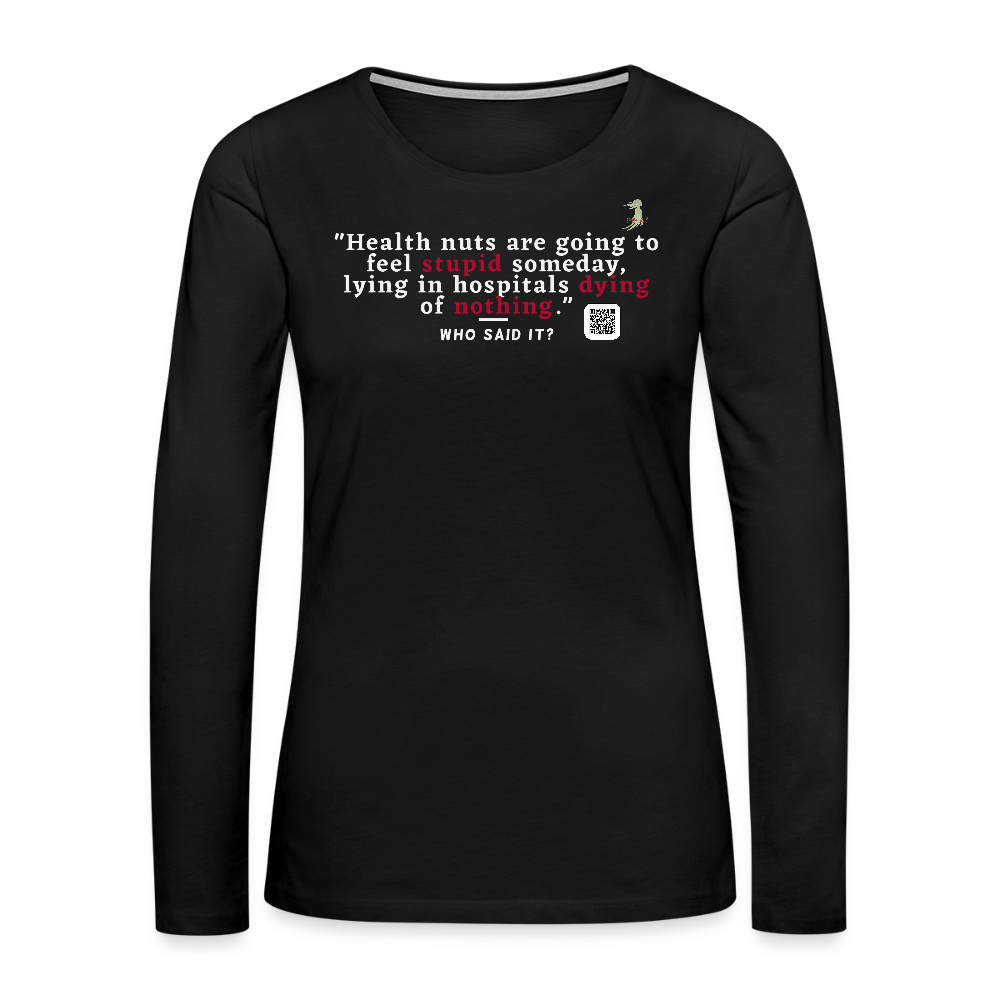 Ever feel like life’s too short for kale smoothies and endless gym sessions? Slip into our cheeky “Health Nuts” Long Sleeve t-shirt and let the world know you’re on team “live a little”! Featuring the hilarious Redd Foxx quote: “Health nuts are going to feel stupid someday, lying in hospitals dying of nothing” boldly printed in playful, retro-inspired fonts on super-soft, premium cotton that’s as comfy as your favorite guilty-pleasure snack. This adorable t-shirt is perfect for lazy Sundays, coffee runs, or gifting to that friend who’s always preaching about superfoods (we won’t tell if you add a donut with it ). Besides, who says sarcasm can’t be cute? Grab yours now and wear your witty wisdom proudly. After all, laughter is the best medicine… or is it pizza? You decide!