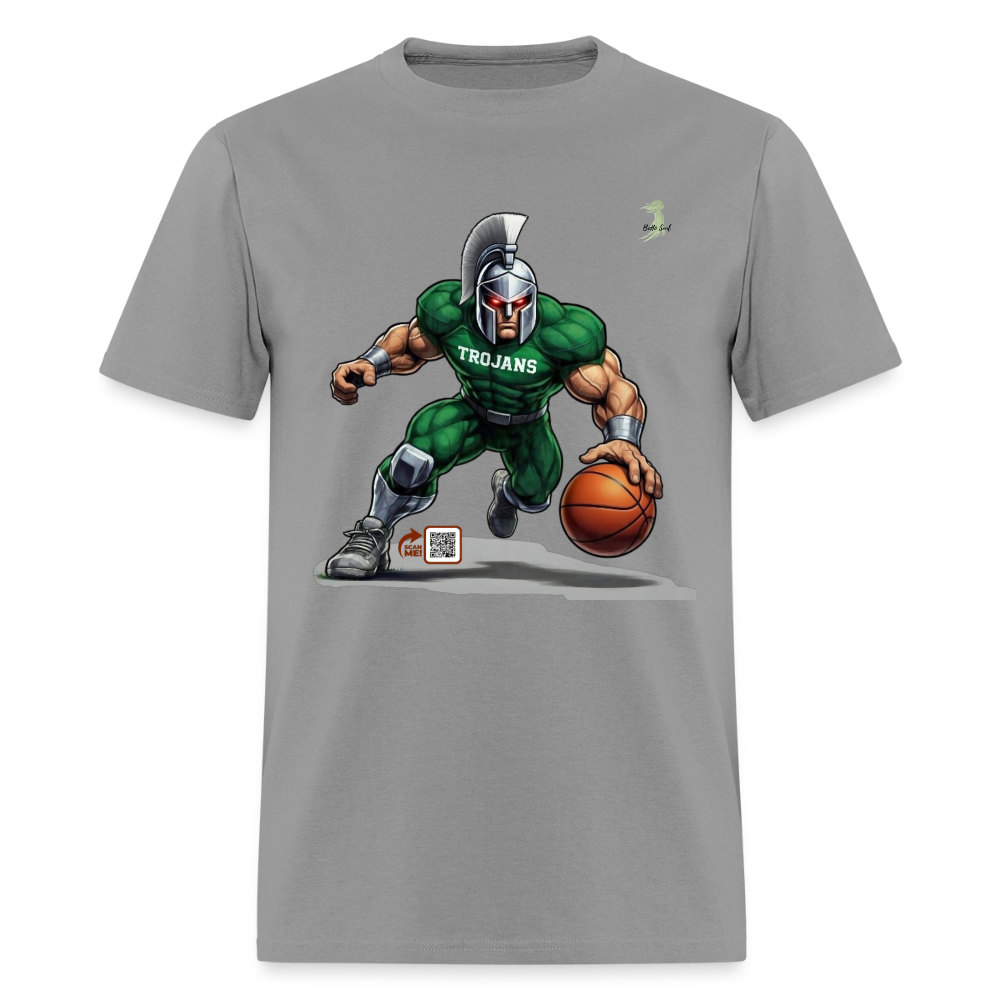 Unleash your inner warrior on the court with this epic Trojan Basketball Tee! Featuring a fierce, muscle-bound Trojan gladiator in a dynamic dribble stance, clad in a vibrant green jersey emblazoned with “TROJANS” and silver armor accents, this graphic blends ancient valor with modern hoops intensity. His glowing red eyes and majestic white plume helmet radiate unstoppable power, making it the perfect design for basketball fans, athletes, or anyone ready to conquer the game. Printed on soft, premium cotton for all-day comfort—wear it to dominate pickup games or cheer from the sidelines!